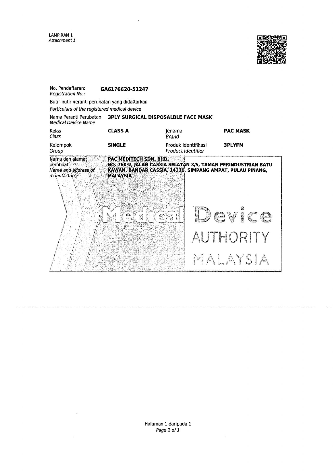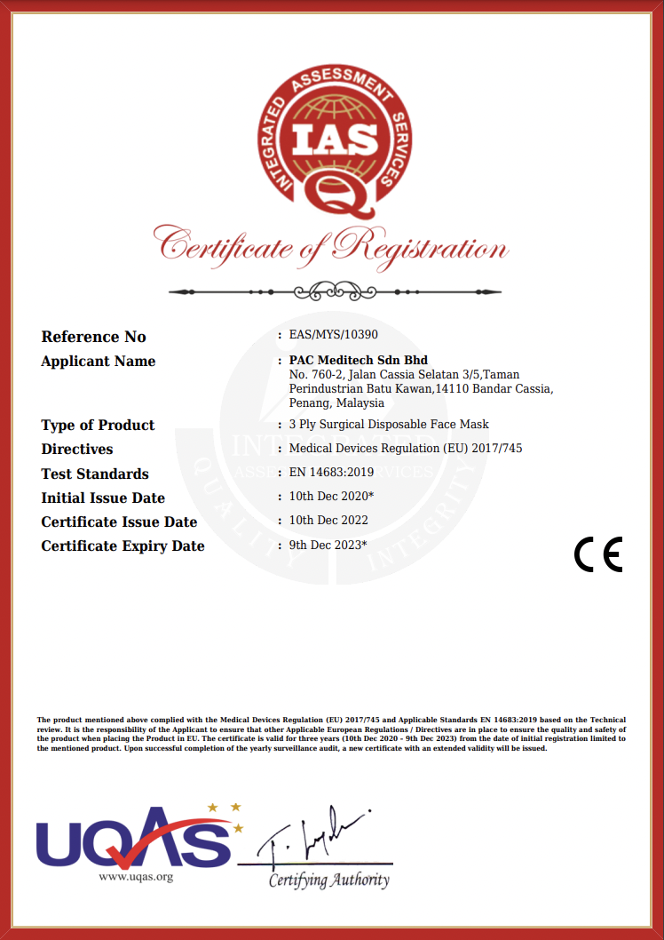 PAC Meditech Sdn Bhd has obtained ISO13485: 2016 certification from Medical Device Authority (MDA) approved certification body. We have also obtained Company Establishment License and Product License from MDA. At the same time our 3-ply Surgical Face Mask is certified with CE Marking.