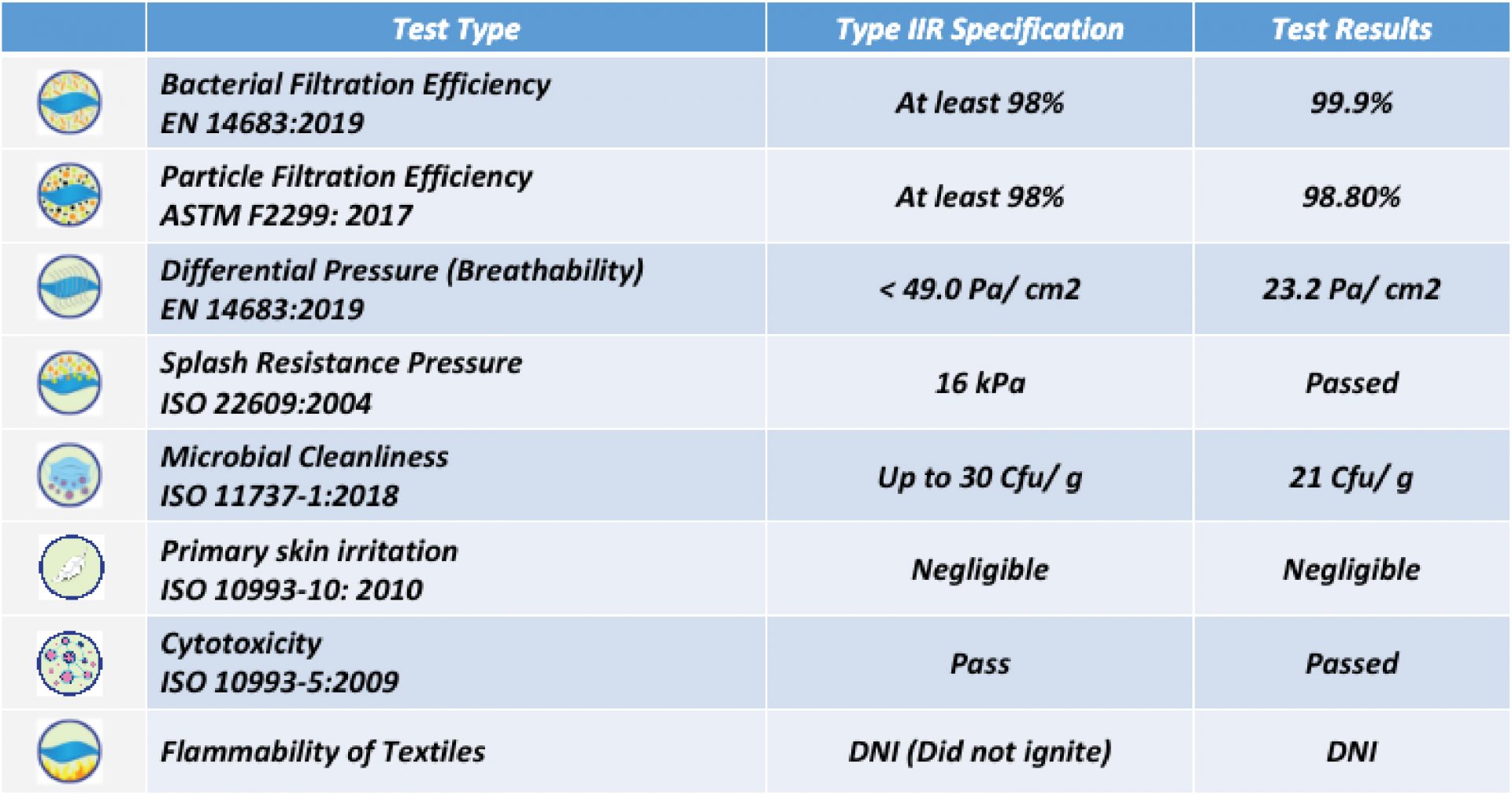 In compliance with MDA requirement and the international standards, tests were performed for our 3-ply surgical face masks by the independant accredited labs and we passed the eight performance metrics tests with excellent results.